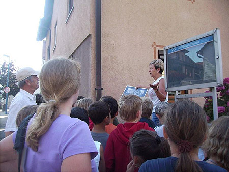 Anhand der Bilder und dem Betrachten der heutigen Gebäude konnten die Kinder rasch erkennen, wie sich der Ort veränderte. Neben den baulichen Veränderungen zeigte August Schwab auf, unter welchen räumlich beengten Verhältnissen die Familien lebten. So waren die Kinder beeindruckt, als sie in der Hellenstraße das Bild eines alten Bauernhauses sahen, in dem einst eine Familie mit 13 Kindern lebte. |